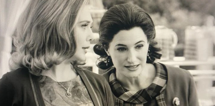 Written by Jac Schaeffer and directed by Matt Shakman, WandaVision stars Elizabeth Olsen as Wanda Maximoff/Scarlet Witch, Paul Bettany as Vision, Randall Park as Agent Jimmy Woo, Kat Dennings as Darcy Lewis, Teyonah Parris as Monica Rambeau, and Kathryn Hahn as Agnes. New episodes air Fridays on Disney+.