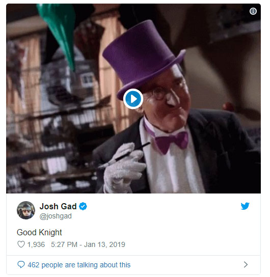 In January Josh Gad teased Penguin as the villain in the Batman on twitter HERE. If Penguin winds up appearing in The Batman, it seems likely Gad will be considered by Reeves to play the role. Reeves has remained mum on the subject of The Batman’s primary foe. Asked by THR in recent days of Gad’s repeated teasing of the role, Reeves said, “I love Josh Gad. We’re good friends.” Even so, nothing concrete came from Reeves.
